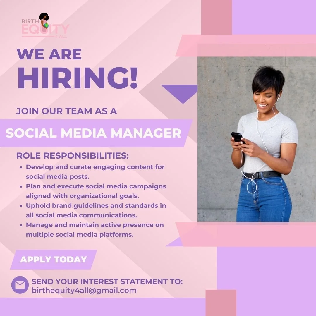 Application Process: To apply for the Social Media Manager position, please submit a resume/CV, a brief cover letter outlining your interest in the role and relevant experience, and samples of your work or links to social media profiles you have managed to birthequity4all@gmail.com. Applications will be reviewed on a rolling basis. Shortlisted candidates will be contacted for interviews.